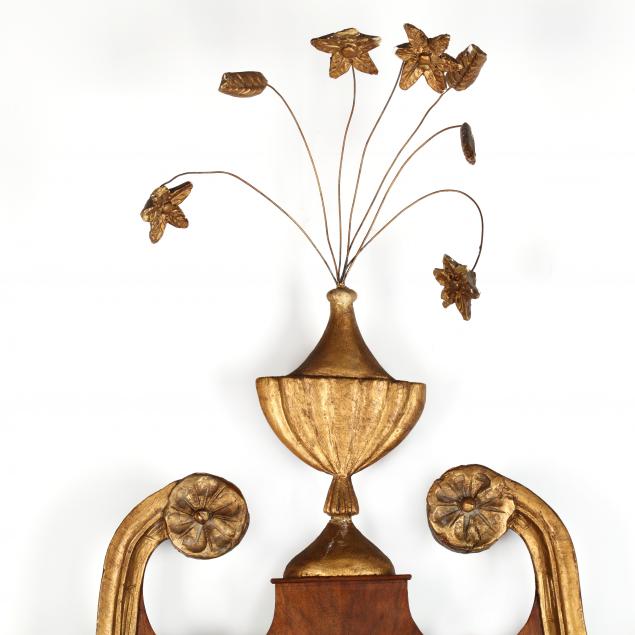 Sun fading to finish; gesso chips to upper flowers; very small veneer chip to bottom edge; some silver loss to mirror.