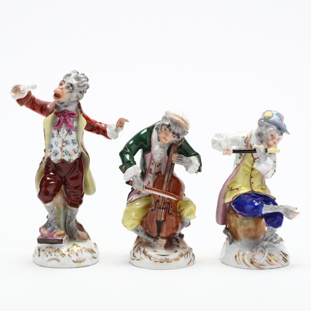 Blue printed factory mark of Carl Thieme Potschappel, second half 19th century, hand painted; including a conductor and (11) male and female musicians; impressed marks include: 9407, 9412, 9402 D, 9405, 9404, 9411 D, 9406 D, 9409 D (with chip to brim of cap), 9403 (with loss to end of bassoon), 9410, 9408, and W (loss to neck of violin).