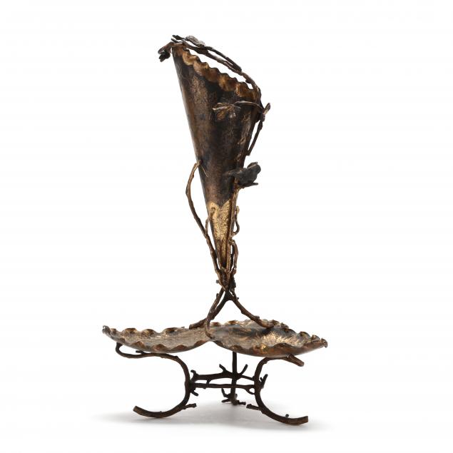 Circa 1875, likely French, unmarked, the central conical vase flanked by leafing branches and a small songbird, raised above three leaf form wells, all atop branch form supports, all surfaces with ornate engraving of foliate, floral and berry design.