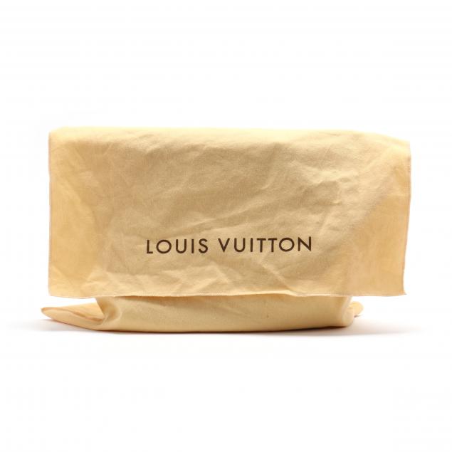 Made in France, crafted of signature Damier canvas with vachetta leather trim, polished brass hardware, and the so convenient side bucket pockets. The top zipper opens to an ivory fabric lining with two pockets. Date code SD1100 in outside pocket seam. With dust bag.