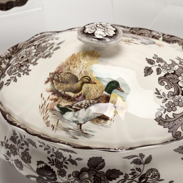 To include a serving platter (16 x 12.5 in.); a lidded tureen (7.5 x 14 x 9 in.); a lidded serving dish (6 x 10 in. diameter); and a coffee pot (8 in.), each transfer decorated in brown and with various game birds, marked.