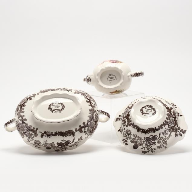 Platter with knife marks; tureen with light crazing; all with some staining; otherwise good estate condition.