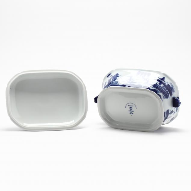 To include a lidded tureen (9.5 x 13.5 x 9 in.); a rectangular dish (6.25 x 7.75 in.); seven dinner plates (10.25 in.); seven porringers (6 x 5 in.); twelve tea cups and (17) saucers, marked.