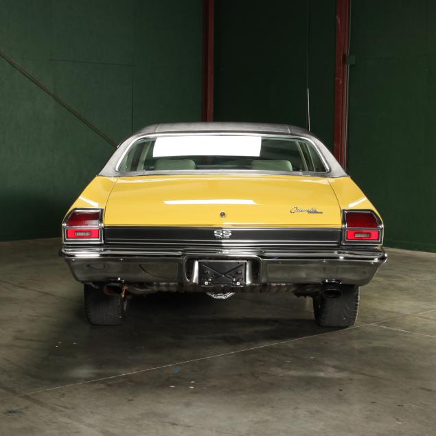 Exterior with a repaint in Daytona Yellow (76 Paint Code) with black stripes. Original White seat interior (791 Code). With black vinyl top. Center console with Staple Shifter. Chrome American Racing wheels and Riken tires. In 1969 the Daytona Yellow paint code was limited to SS cars only and was the rarest color available.