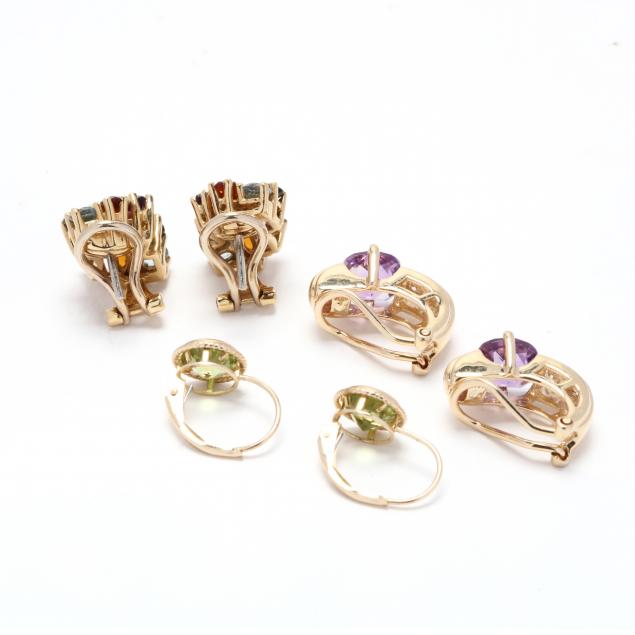 The first bezel set with a round cut peridot (4.5mm) within a twist surround and completed with lever backs, stamped 14K and signed LM (8.4mm); the second set with a cushion checkerboard cut amethyst and with channel set diamond accents, completed with omega clip backs, stamped 14K and with a maker's mark (11/16 in.); and the third centering on full cut diamond accents and with variously cut gemstones to include amethyst, citrine, green garnet and aquamarine, completed with posts and omega clip backs, stamped 750 for 18KT (11/16 in.).