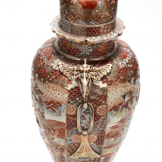 20th century, surmounted with a dome cover with a shishi lion finial holding a ball, the baluster body flanked by faux ornate elephant head handles, elaborate satsuma with raised moriage decoration in textile pattern ground and raised applique of two noble male figures in Heian period dress on one side and samurai figures on the reverse, sits on fitted satsuma base decorated in same manner and raised on five lion head mask feet