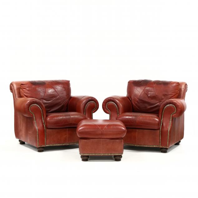 Late 20th century, stitched red leather, the chairs with stationary cushions, brass nailhead trim, turned wood feet, with a conforming ottoman, labeled Otium S.P.A.