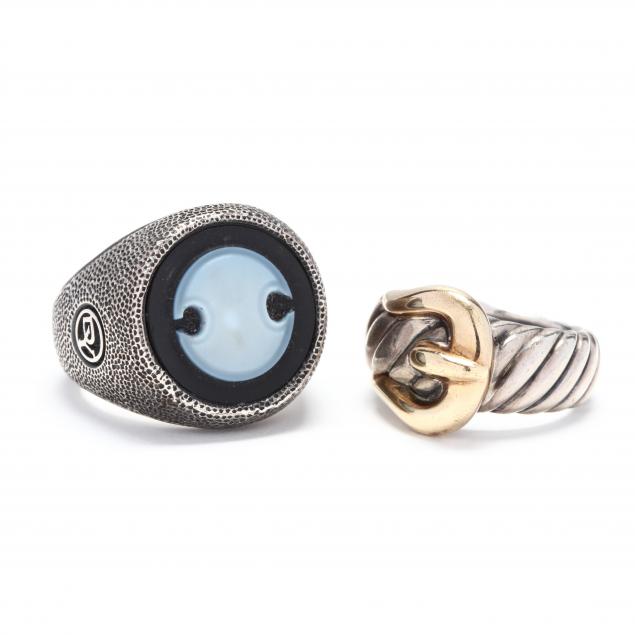 The first designed in a buckle motif with a yellow gold buckle, with maker's mark and stamped 925 / 750 (ring size 6); the second a signet ring set with a circular cut banded agate and silver mount with stipple finish, signed and stamped 925 (ring size 8.25).