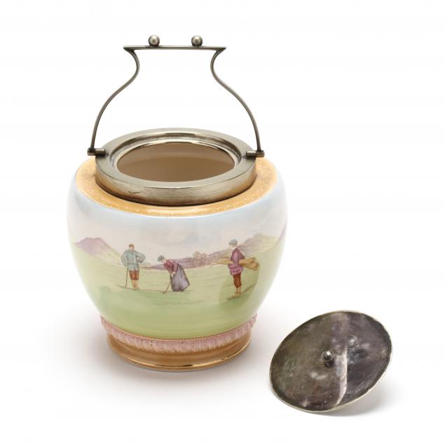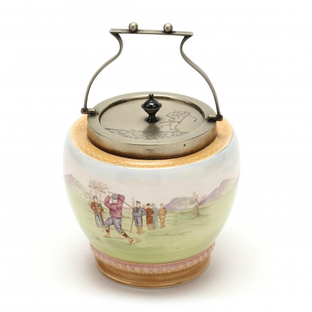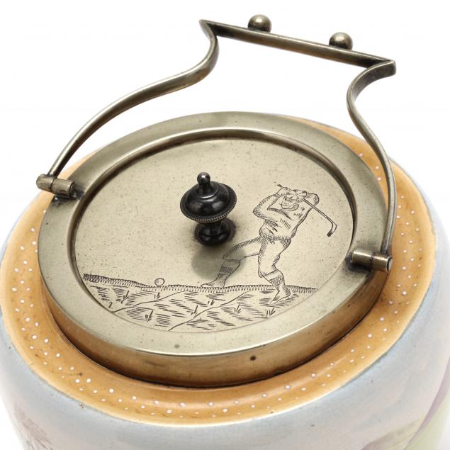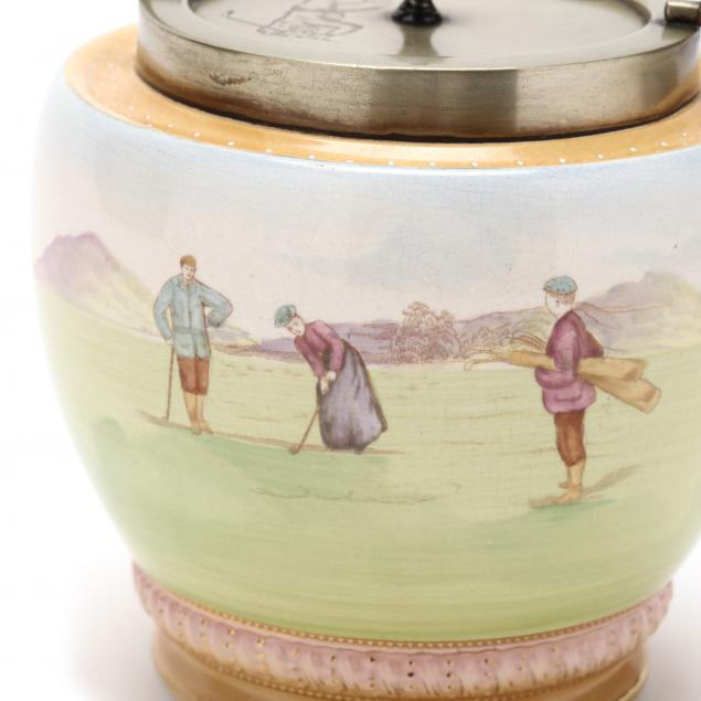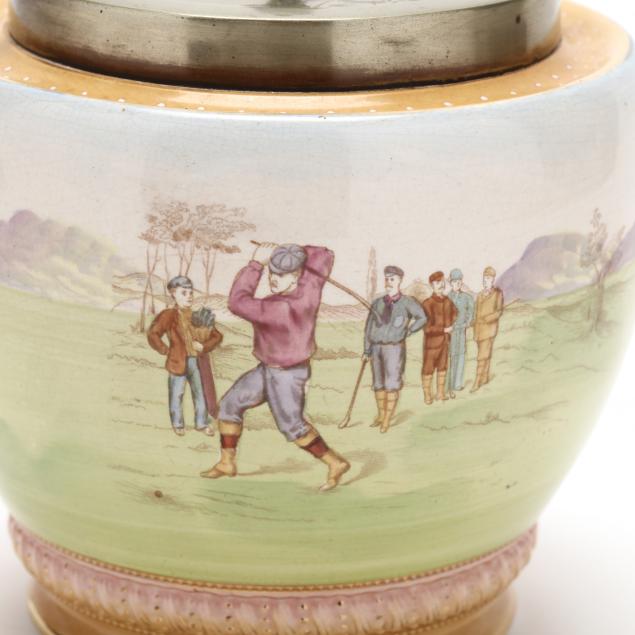 English from 1895, decorated with golfers against a serene grassy setting, distant hills, engraved brass cover, swing handle, marked on the bottom with registry number.
