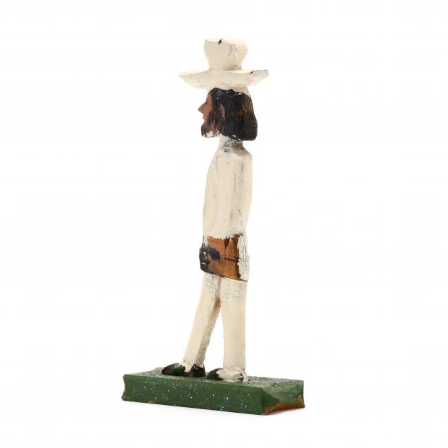 A carved and painted representation of Abraham Lincoln presented as a standing figure in a white suit and top hat applied to a paint and glitter decorated platform, signed on the bottom "Elijah Pierce."