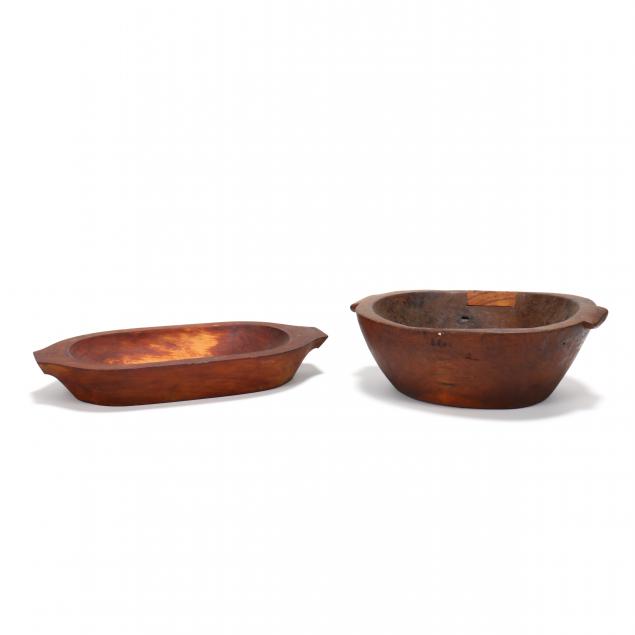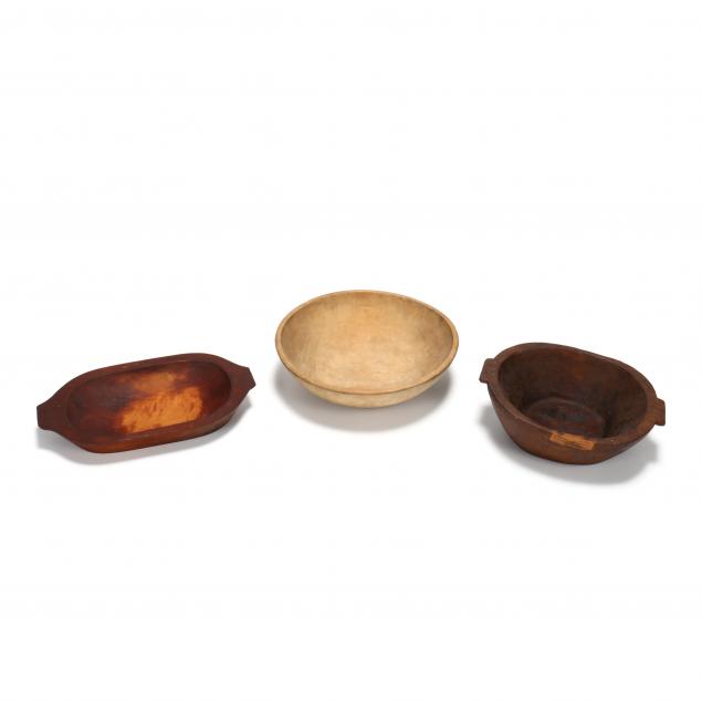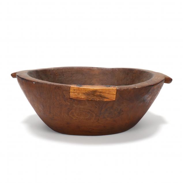 Largest with hairline cracks; the dark circular bowl with an old patch to the rim; staining throughout.