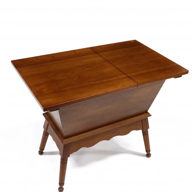 1950s, rectangular top with hinged lid, tapered box with scalloped skirt on turned legs, labeled.