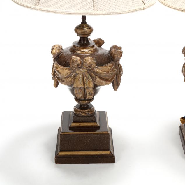 Second half 20th century, carved wood urns with a brown faux stone finish with carved swag and ribbon in gilt surface, with paneled shades.
