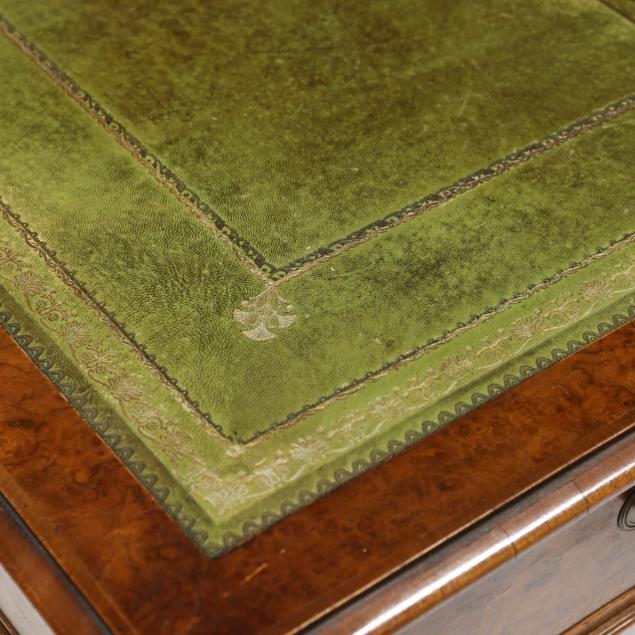 Second half 20th century, burlwood veneers and oak, oak secondary, rectangular top with inset green leather, banded edge, the front and back with three side-by-side cock beaded and banded inlay drawers each, raised on paneled legs with marlborough feet on casters.