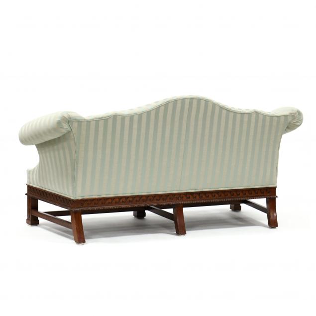 Late 20th century, mahogany, green striped upholstery, loose cushions, wavecrest seat rail with gadrooned edge, on six fretwork legs, with stretcher base.