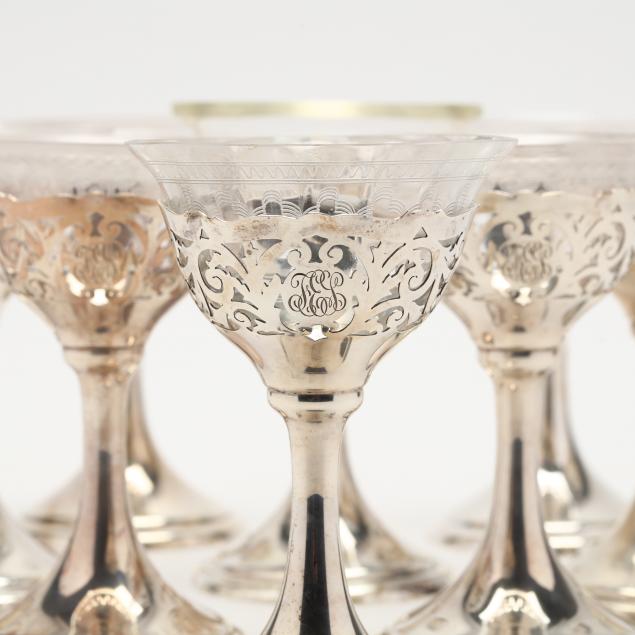 Model number 1352A, 1914 date symbol, each with cutwork bowl and period script monogram "FES," with (7) elegant glass liners (each with chip) and (3) replacement liners.
