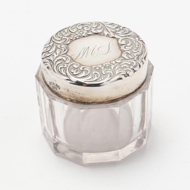Each with glass jar and silver cover, two are monogrammed, two are marked "Sterling" and two are unmarked.