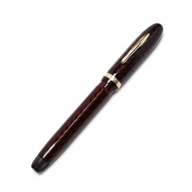 1930s, red/black herringbone acrylic with gold tone mounts, 14k gold nib.