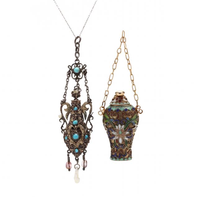 cloisonnés individually filled with colored enamels, unmarked (2 in., excluding chain) (with later applied gilt metal handles and gold chain); the second an unmarked silver and wirework scent bottle further decorated with turquoise and pearls, likely Continental (3.25 in., to top of decorative scrollwork bail) (missing one pearl to handle).