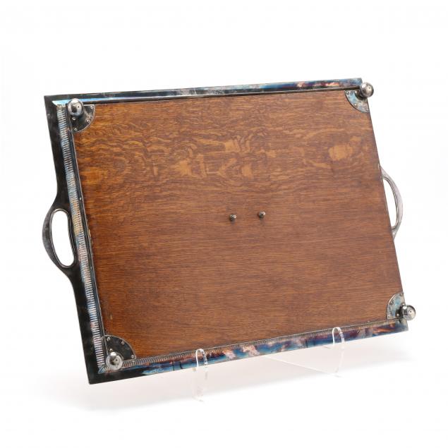 Missing (8) screws connecting gallery to tray, and with several loose screws; some staining and wear to finish on oak; some wear to plating.