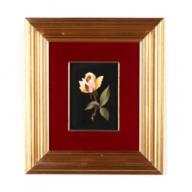 By Gina Contini, mid-20th century, stamped to the verso, multi-colored hardstone, presented within a burgundy velvet mat and gilt frame.