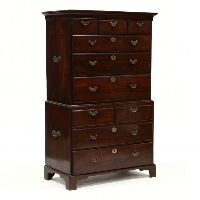 Circa 1800, two-part form, oak secondary, dovetailed case with applied cove molded cornice, upper case with three over three graduated lipped drawers, lower case with two over two graduated lipped drawers, sides featuring bail handles, raised on shaped bracket feet.