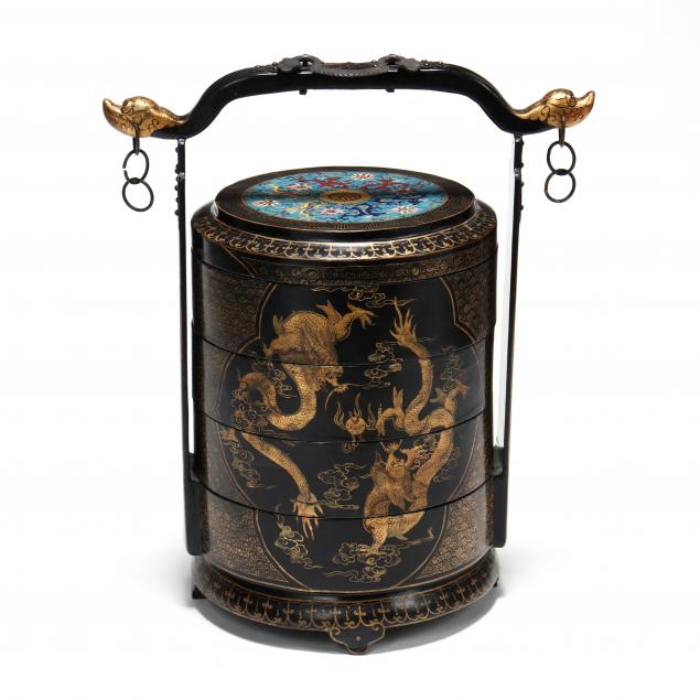 20th century, an ornate large black lacquered wedding basket with four sections, the top inset with blue cloisonne with six dragons in red, dark blue, and yellow enamels, surrounding a longevity symbol, the baskets are painted on the side with two four claw dragons in serpentine position chasing a flaming pearl in the center amidst Chinese clouds, at edges of carrying handle are gilded mythical beast heads holding bronze rings, raised on shaped