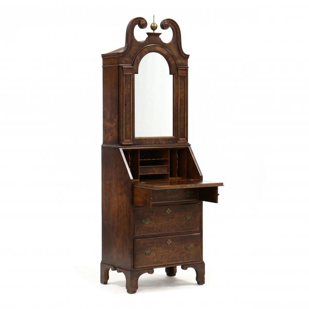 Mid 20th century, one-part form, broken arch pediment, with hinged mirrored tombstone door, with painted shelf interior, over a slant front lid with divided and drawered interior, over three graduated drawers raised on shaped bracket feet.