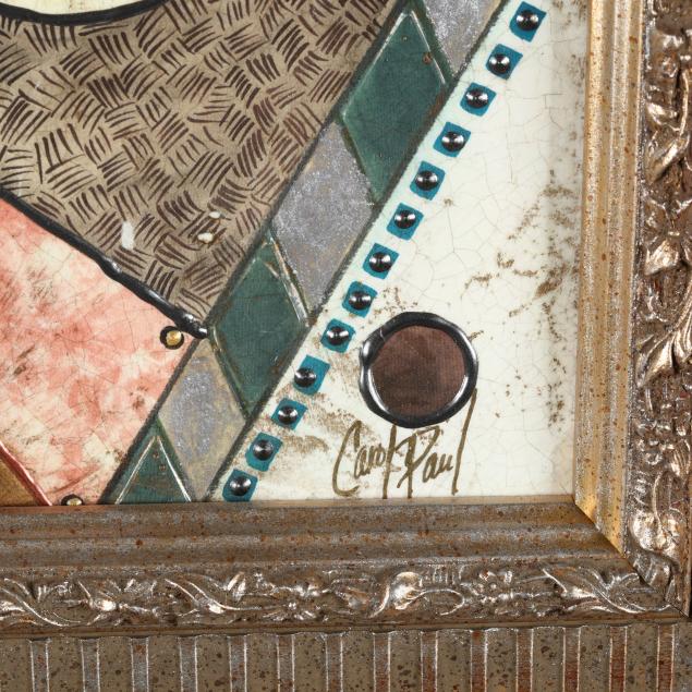 Mixed media on board, signed at lower right, presented in an ornate gilt and silvered frame.