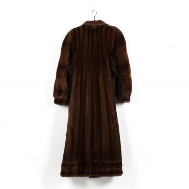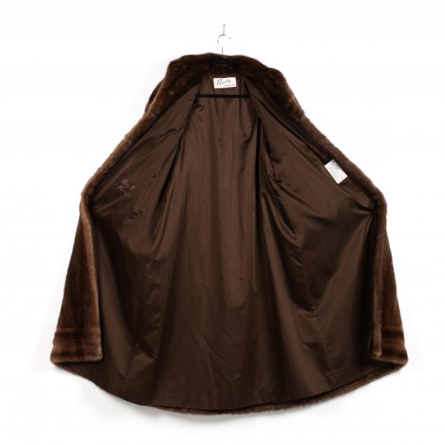Medium to dark brown color, designed with a small lapel collar, bracelet cuff sleeves, hook and eye closure, fully lined with French hem and embroidered name. Retailer label Ronley.