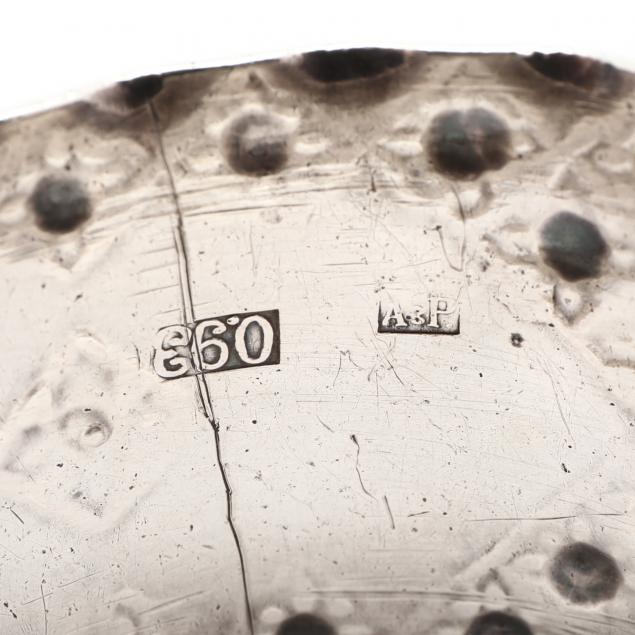 The first with mark of Sanders & Mackenzie, Birmingham (rubbed date letter), engine turned decoration and period monogram "MJL" (1 1/8 x 1.75 in. diameter); the second a very fine hand-wrought napkin ring with inset opals, the maker's mark appears as "A&P" in rectangular punch and also marked "0.93," no monogram (1.25 x 1 7/8 in. diameter).