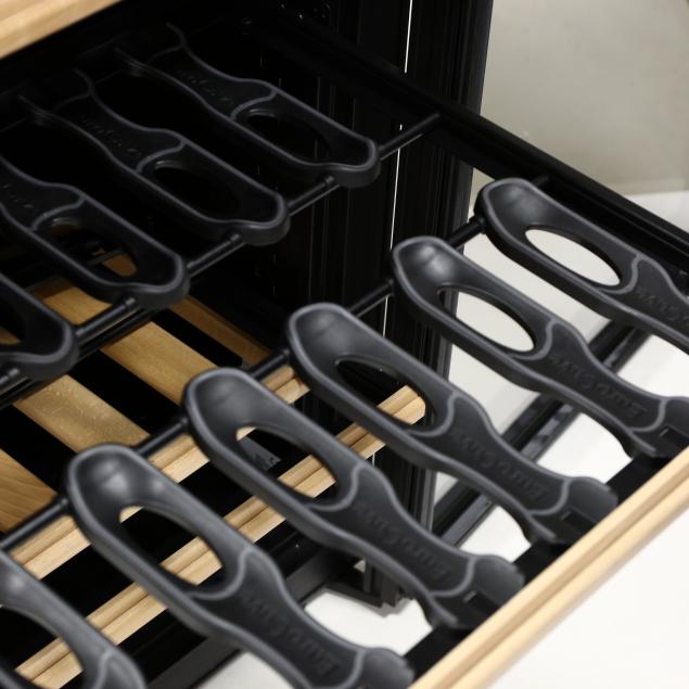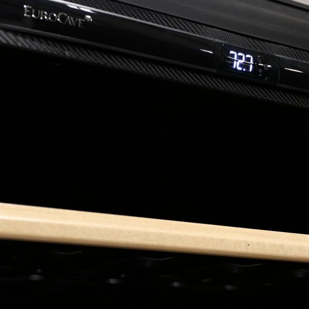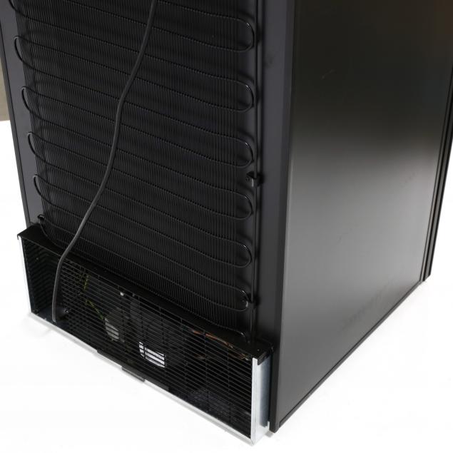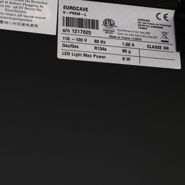 France, 2016, black painted metal, hinged glass door, shelved interior, holds approximately 150 bottles, labeled.