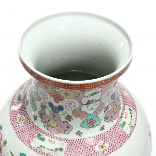 20th century, based on Qing dynasty solider vases popular during the Qianlong period, each floor vase of baluster form with waisted neck, decorated in bright enamels with a pair of phoenix surrounded by large peony blooms rising from blue and gray rockwork in a lush garden, all within pink diaper bands, the domed cover decorated in same vibrant manner as vase and surmounted by a yellow foo lion finial, the combination of phoenix and peonies represents wealth and good fortune.