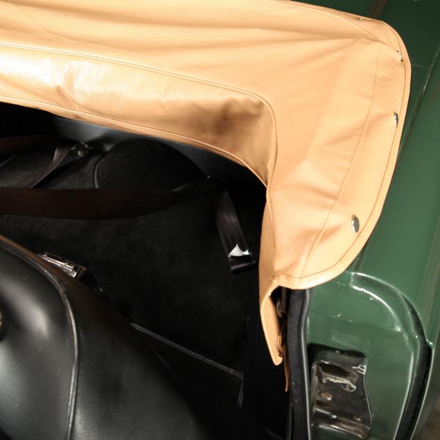 The exterior in a period correct single stage urethane paint in British Racing Green that shows well and does not present as "over restored". The interior has been upgraded with adjustable leather seats with headrests, three-point harness', black pile carpet, a leather wrapped steering wheel, and a new wood dash. All of the original chrome shows well and the window rubber, weatherstripping and seals have been replaced. A new tan hood was fitted with a matching cover. All of the instruments work including the interior lights.