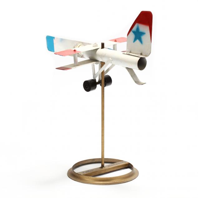 Yard Art construction of a prop plane composed of painted sheet metal and cast metal hollow tube, single turning propeller, raised on a metal tubular stand with circular base, signed on the base "Vollis Simpson 97". Not displayed out-of-doors.