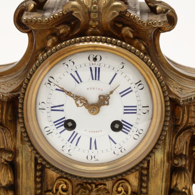 19th century, enamel face with Roman numerals signed "Kreitz A Anvers, ornate gilt brass case, urn finial with laurel swag, floral decoration, on shaped base.