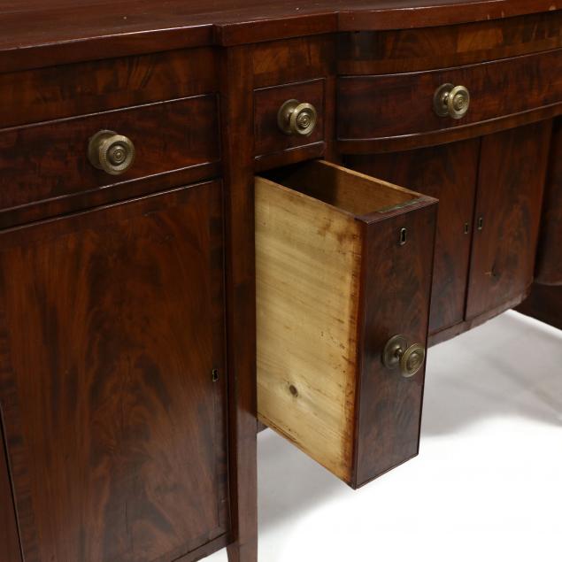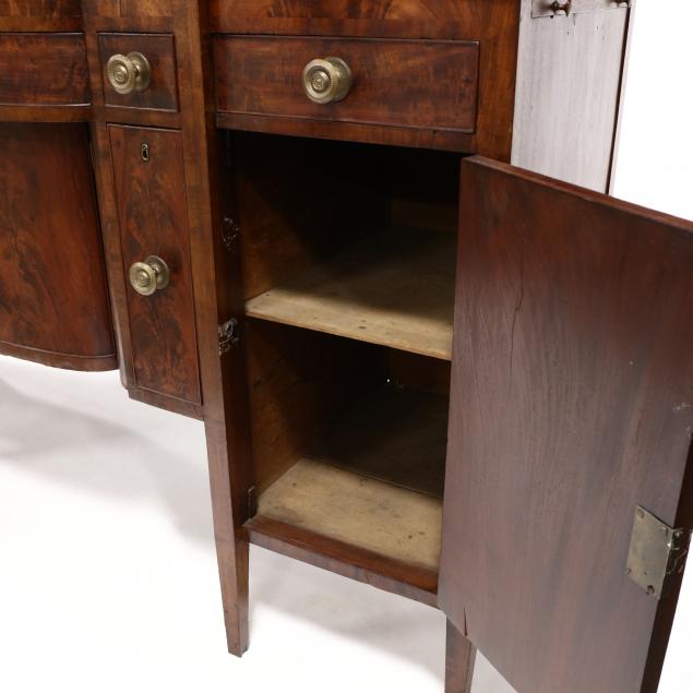 Circa 1800, mahogany, mahogany veneer, white pine secondary, bowfront form, central convex drawer over two hinged convex doors with open interior, flanked by two small drawers over two bottle drawers with divided interiors, flanked by two drawers over two hinged cabinet doors with banded inlay, shelved interior, sides with pull-out serving slides, on square tapered legs.