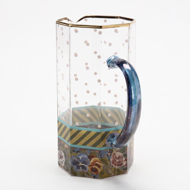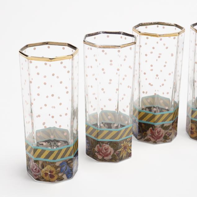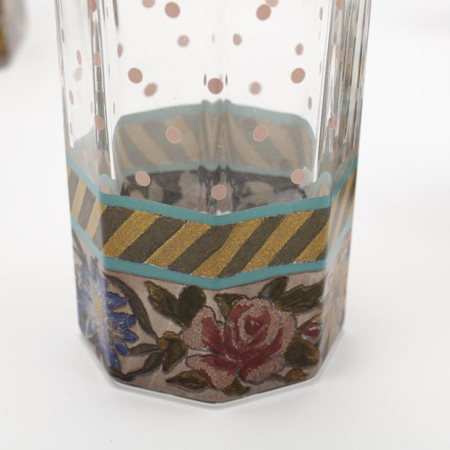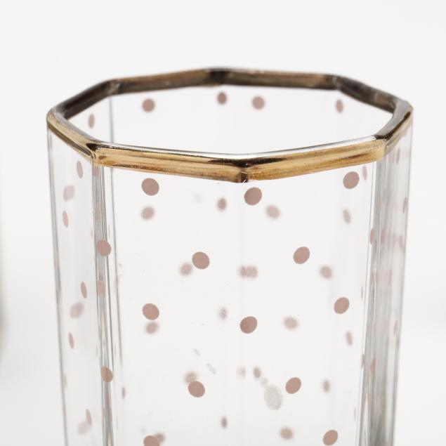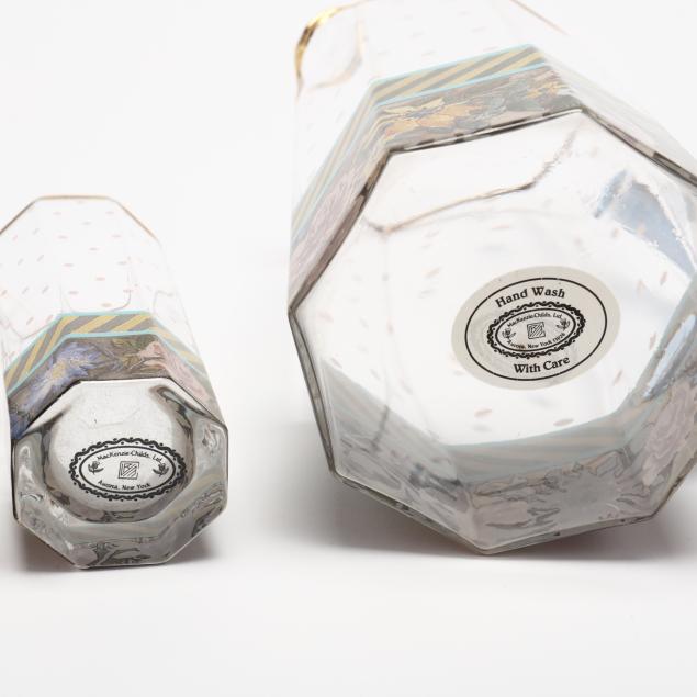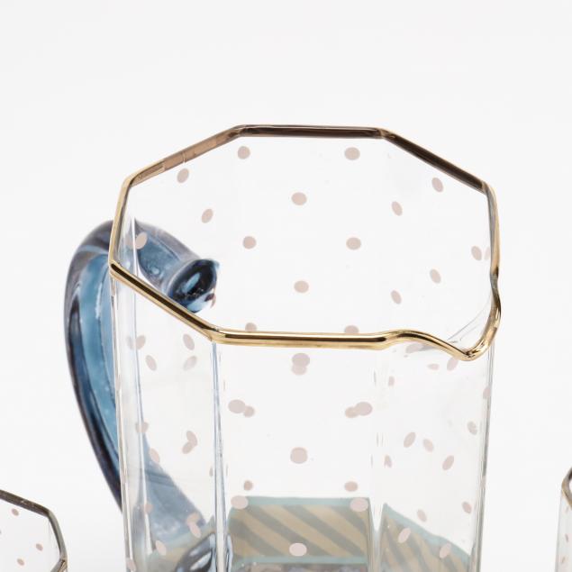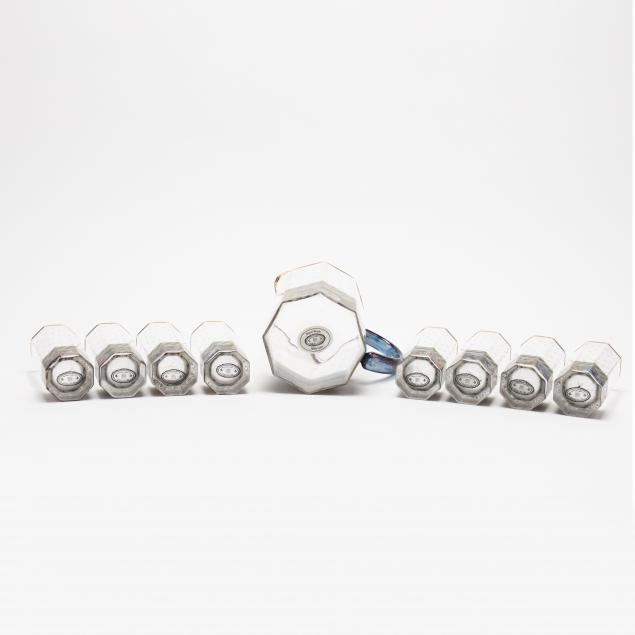 Octagonal pitcher (8in.) with floral patterning, embellished with a gold lustre rim, includes 8 matching glasses (5 in.), all marked.