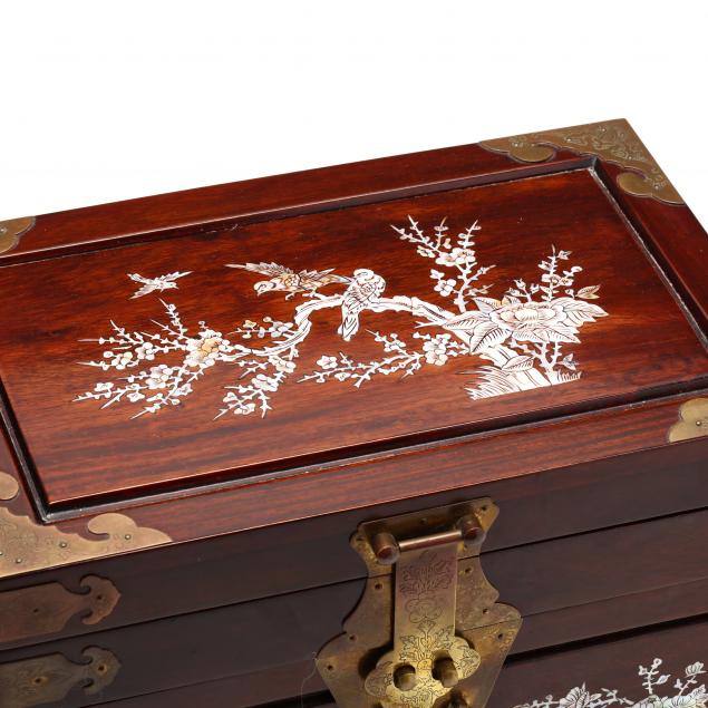 20th century, top cover and lower doors are both inlaid with Mother of Pearl blooming branches and birds, bands of shaped brass hardware are wrapped around the edges of the box and incised with bats and flora, hinged lid opens to flat storage area, two hinged doors on front side open outwards to reveal three interior drawers, all of the interior is lined with red silk phoenix and dragon fabric, two metal handles with coin motif flank the box, raised on four short feet.