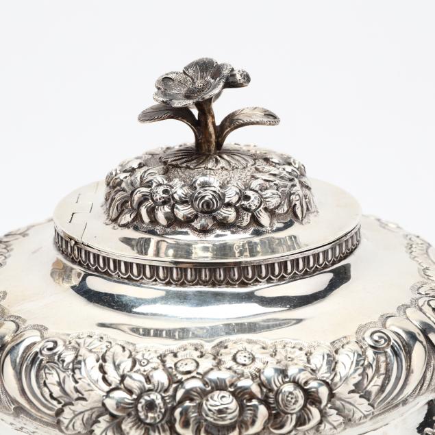 Three pieces including: a teapot with mark of Edward Power, Dublin (1823), finely executed floral chasing throughout and featuring a cast silver floral finial to the hinge cover, raised on four paw feet (7.25 in.); the sugar bowl with mark of Charles Marsh, Dublin (1822); the creamer also with Dublin (1822) hallmarks, but no sponsor's mark. No monograms.