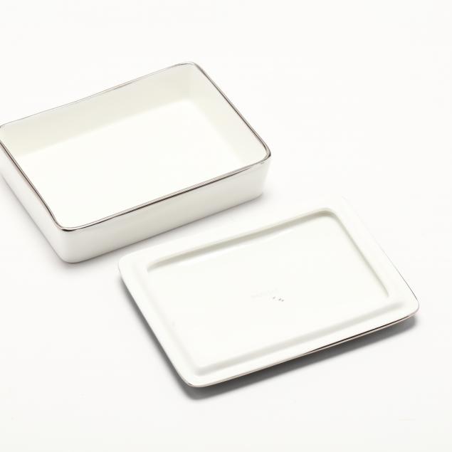 The set includes: eight plates (10.75 in.); eight plates (8 in.); eight bread and butter plates; eight berry bowls; eight bouillon bowls with saucers; eight tea cups with saucers (64 total). Accessory pieces include: two open vegetables (1.5 x 9 7/8 in.; two platters (15.25 in.and 13.75 in.); a tea pot; a covered box; two ashtrays; a gravy and underplate; a cream jug and underplate (12).