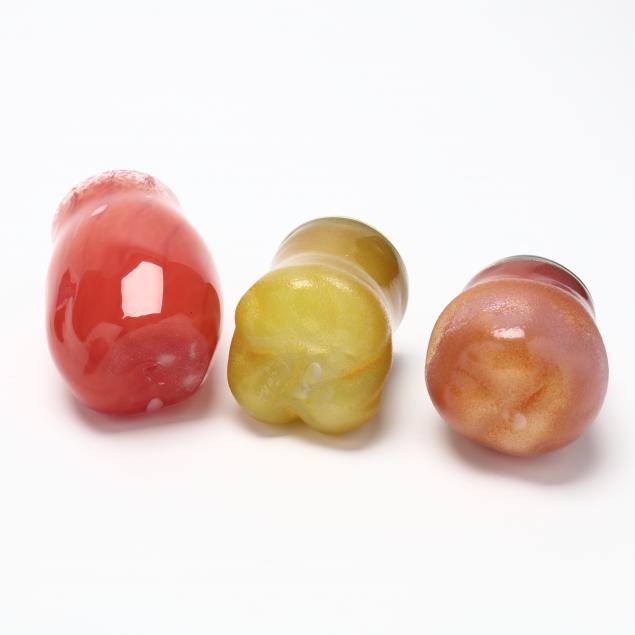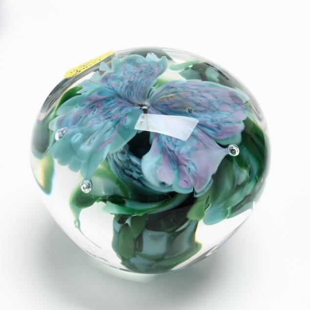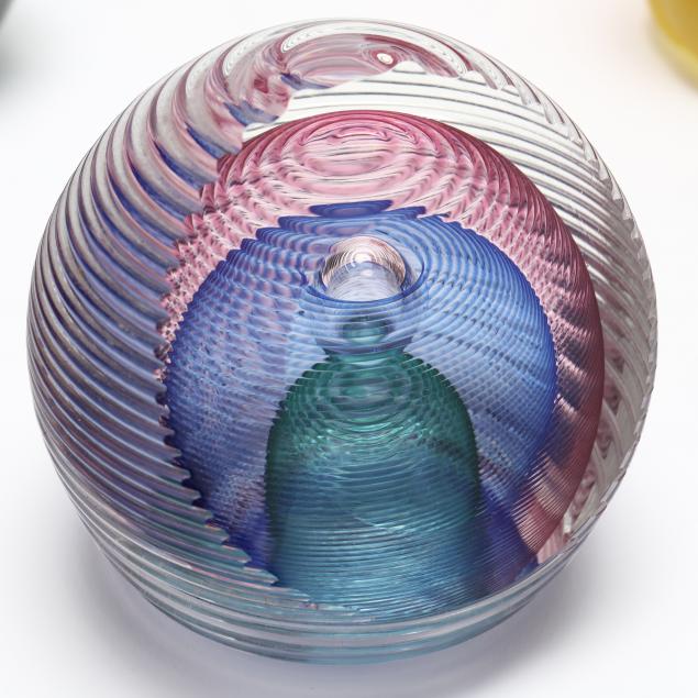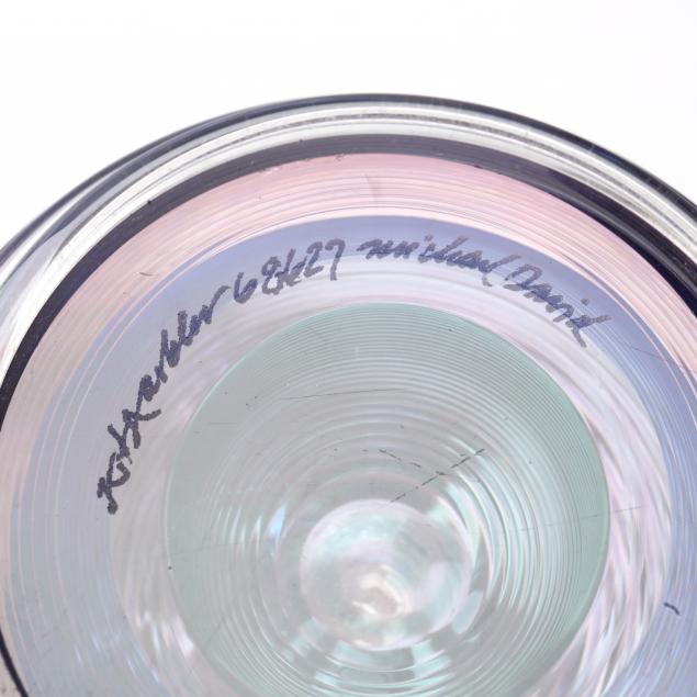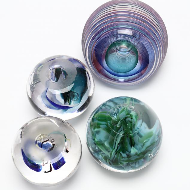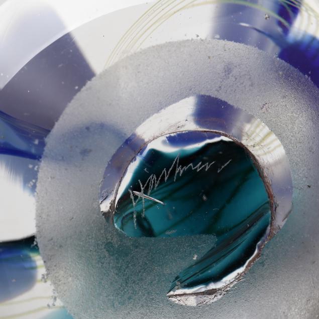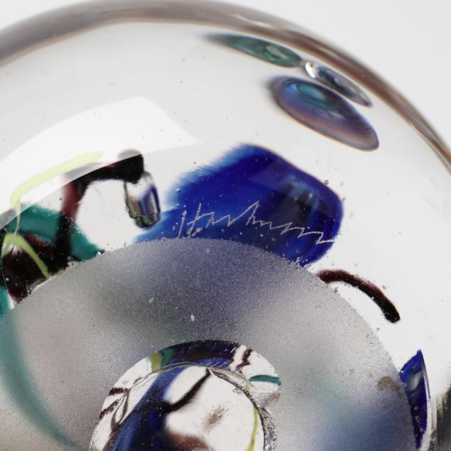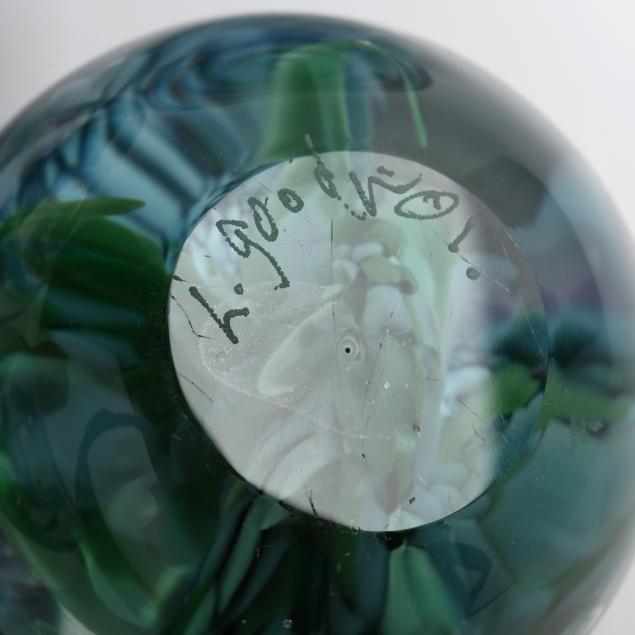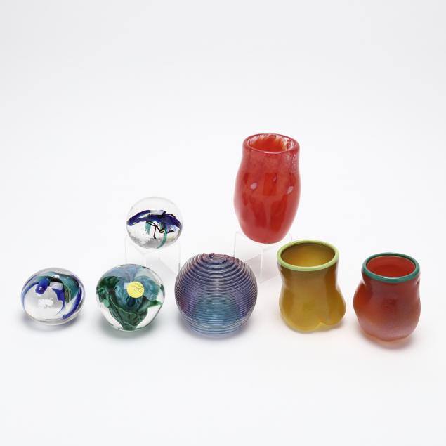 Contemporary hand blown art glass to include: (2) spherical blue, aqua, and silver leaf, signed illegibly; (1) floral spherical weight and (3) vases (two of these are signed and dated '01 by L. Goodwin"); (1) pink and blue signed "Kit Karbler / 68627 / Michael David" spherical piece.