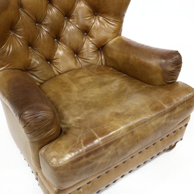 Late 20th century, brown leather, tufted barrel back, loose cushion, large brass nailhead trim, on bun feet, labeled.