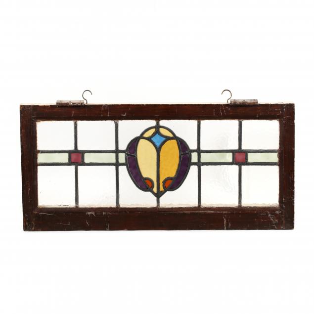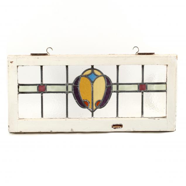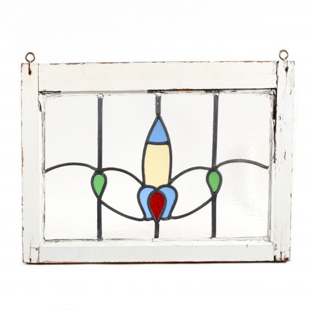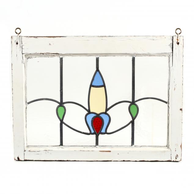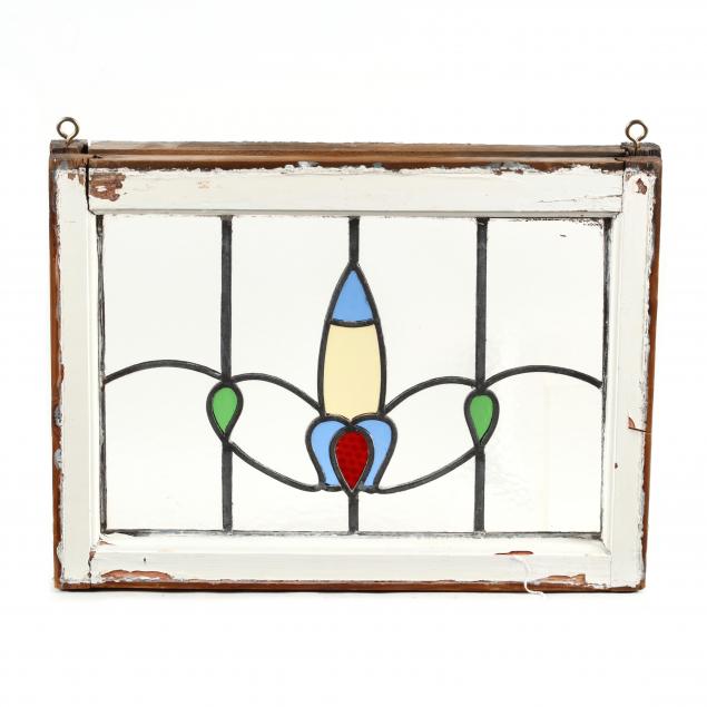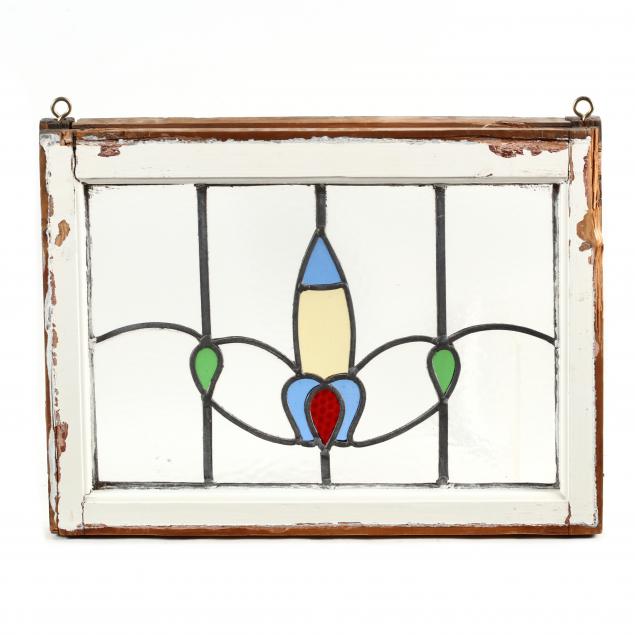 Early 20th century, painted wood frames, including a pair of stylized fleur de lis windows and one longer stained glass window with hinges.
