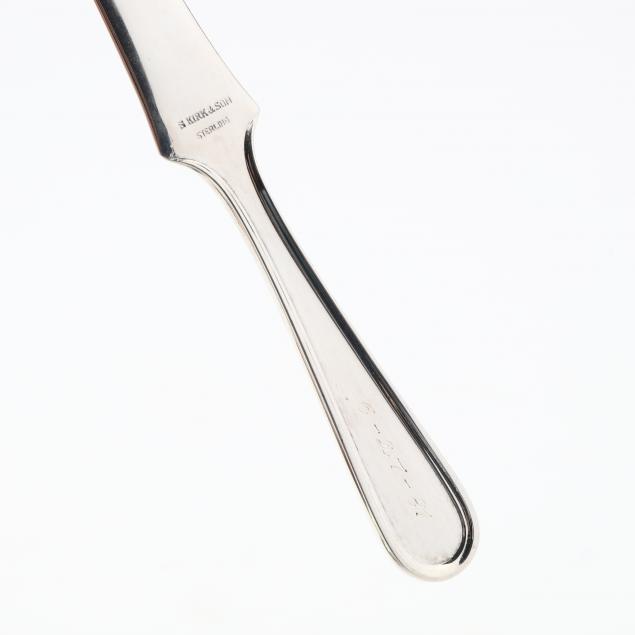 To include: (2) small Gorham sterling silver rectangular dishes (3/4 x 3 3/8 in.); (1) S Kirk & Son sterling silver letter opener with engraved "OLH" and date "6-27-81" on the handle (5.75 in.); (1) Sheaffer's writing pen with Gorham sterling silver and wood base (9 .25 in. tall with pen).