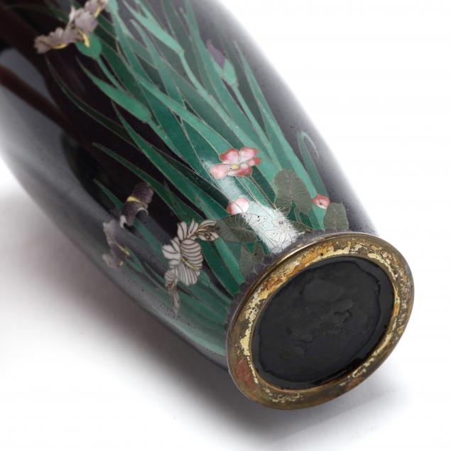 20th century, includes one cloisonne vase with dark blue ground and tall purple and lavender irises, gilt to rim and foot, green enamel to interior, and a satsuma vase decorated with two large shaped panels, one panel with a two Mandarin ducks swimming, the other panel with hanging wisteria blooms, rest of vase has a sapphire blue ground with gilt decoration, signed to underside.