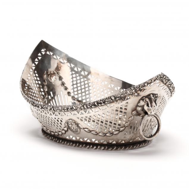 Early 20th century, English, unmarked but similar to pieces made by silversmith Alexander Scott, featuring pierced sides, repousse foliate garlands and lion heads, gadrooned borders along the rim and foot, and ring handles.