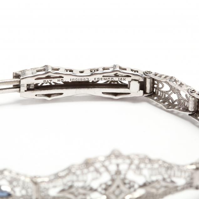 To include: a square link filigree bracelet set with transitional cut diamonds weighing approximately .90 total carat (H-I color, SI clarity) and with milgrain detailing, stamped 14K (3/8 x 7.25 in.); and a rectangular link bracelet with a navette shape link in the center set with single cut round diamond melee accents and marquise cut synthetic sapphires, with milgrain and filigree detailing, stamped 14K (6 in.).