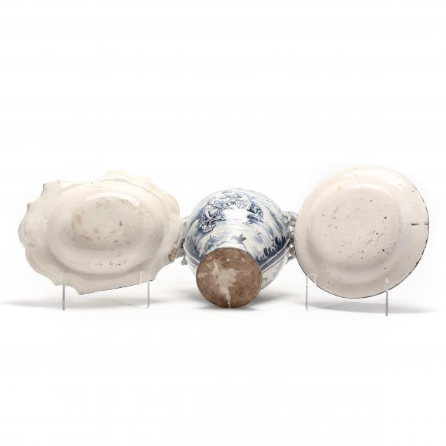 To include: a charger with brushed foliate border in the Delft manner (11.75 in.) (all around glaze flaking to the upper rim); a barber's bowl, oval in form, with a two color scalloped border above a central well with naively painted bird (3 x 14 x 10.5 in.) (original glaze skip to interior; some edge fritting); a double handled urn with stylized snake handle terminals, one side painted with two soldiers, an apocryphal coat-of-arms decorates the opposing side painted date "1716" (13.5 x 11 in.).