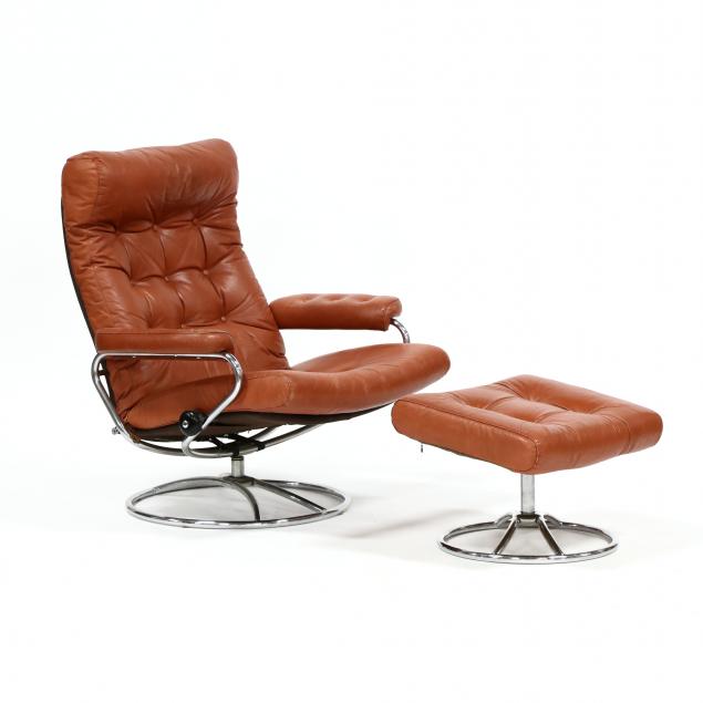 1970s, sienna leather with chrome mounts, swivel chair with adjustable back with conforming swivel ottoman, appears unmarked.